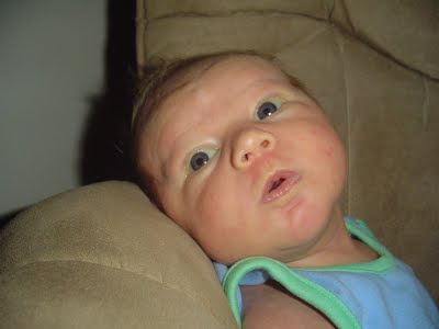 Have I mentioned what a wonderfully sweet baby Andrew is? It's very hard not to compare your children to other children, much less your own children. I say this because Andrew, so far, couldn't be more different than his brother. Where Jacob required lots of bouncing on a red exercise ball to calm his crying, Andrew just needs to sleep or be fed. Where Jacob demanded constant attention and movement, Andrew is content to sit in his little rocker or swing and watch the world go by.